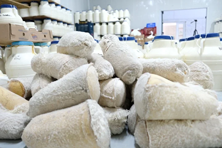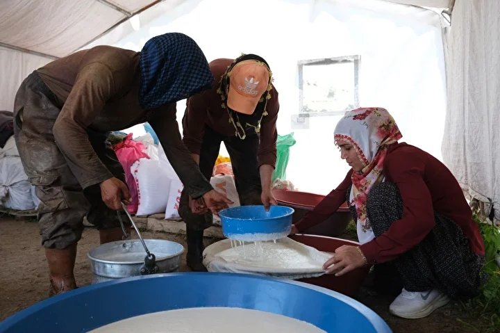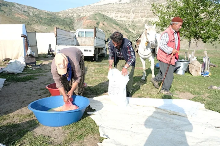 “Sabah saat 10.00 ve 16.00’da sağımlarımız oluyor. Sütleri şirdan maya ile mayalıyoruz. Atlarla yaylalardan peynirleri çadırlara getiriyoruz. Burada çuvallara koyup 15 gün bekletiyoruz. Sonra Kemah tuzu ile baskı yapıyoruz ve 4 ila 7 gün dinlendirdikten sonra soğuk hava depolarına gönderiyoruz.”