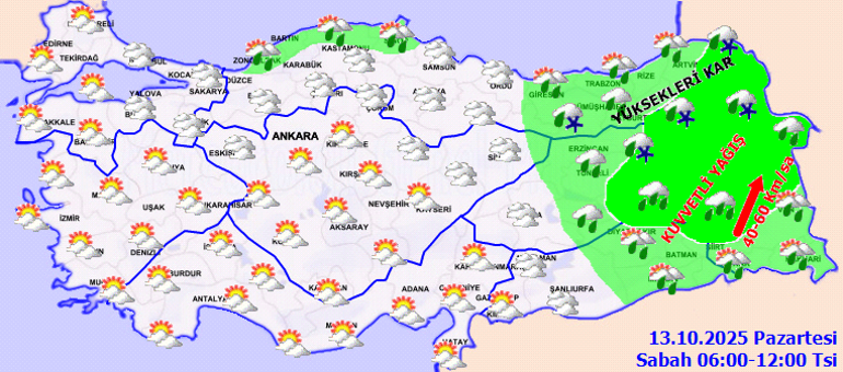 Yapılan son değerlendirmelere göre; bugün akşam saatlerinden itibaren Diyarbakır, Şanlıurfa’nın kuzeyi, Batman, Mardin’in kuzeyi, Elazığ, Bingöl, Muş, Bitlis ile zamanla Erzurum, Ağrı, Van’ın kuzeyi ve Kars çevrelerinde kuvvetli sağanak yağış bekleniyor. Yağışların; Doğu Anadolu Bölgesinin 2000 metre üzeri rakıma sahip yerlerinde karla karışık yağmur ve kar şeklinde olacağı tahmin ediliyor.